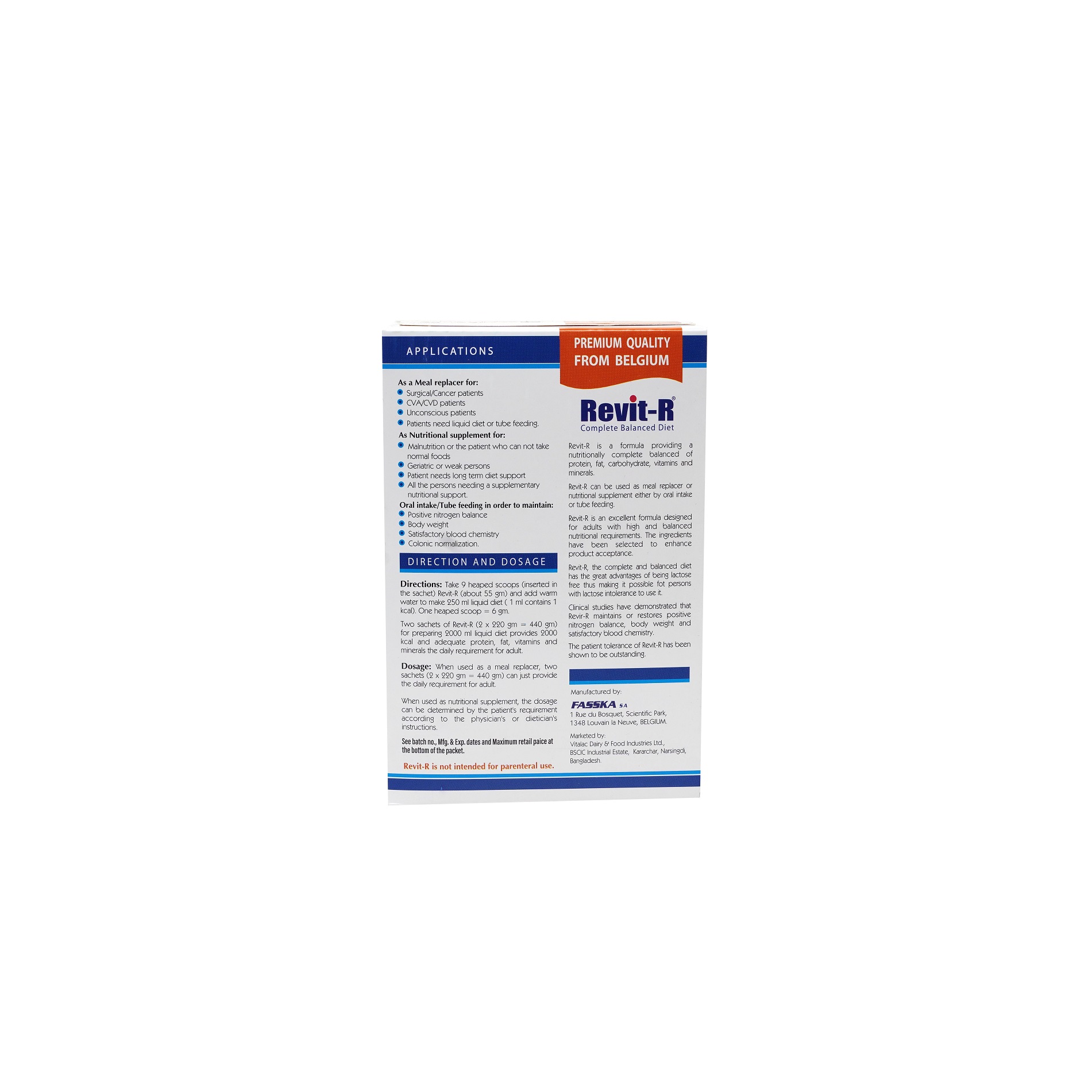 REVIT-R® is a complete balanced formula for adults. It provides the adequate amount of energy, proteins, fats, carbohydrates, vitamins and minerals necessary to cover an adult’s daily requirements. REVIT-R® has been developed for surgical and malnourished patient requiring liquid diet or tube feeding, for CVD patients, geriatric or weak patient. It can be used as a meal replacer or nutritional supplement, either by oral intake or tube feeding for enteral nutrition.